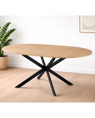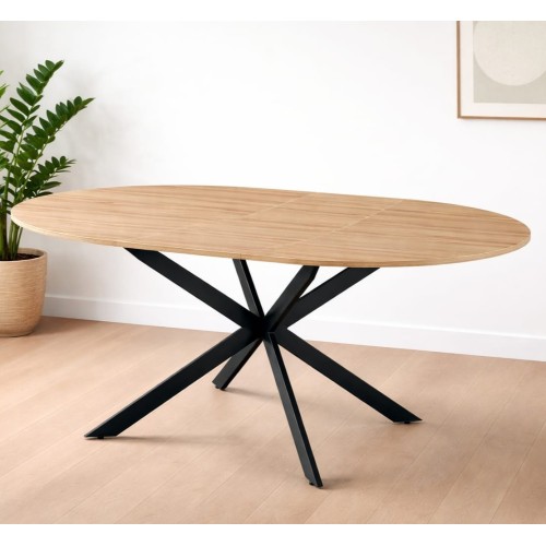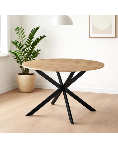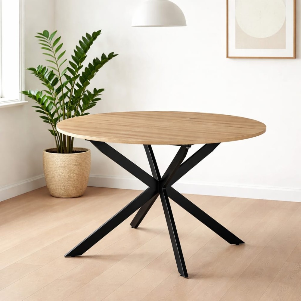 Mesa redonda de comedor extensible, con acabado en melamina color roble amazonía. Patas metálicas rectas en color negro mate.