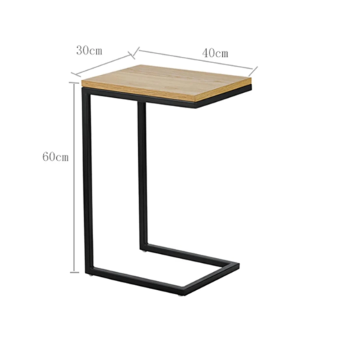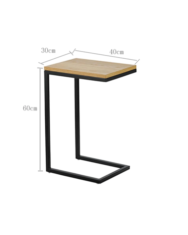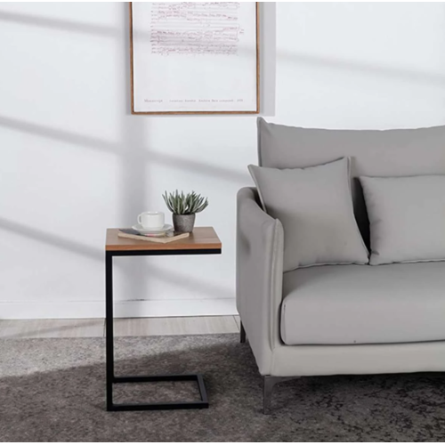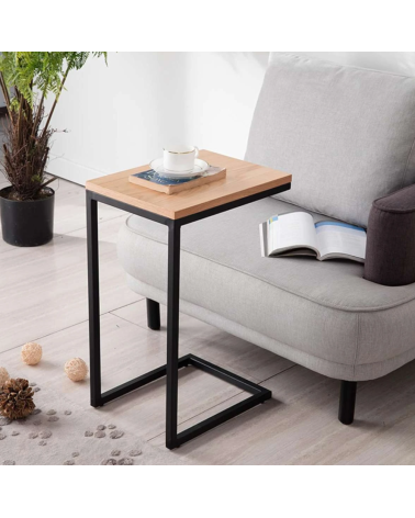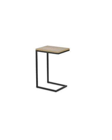 Mesa auxiliar de líneas rectas con sobre acabado en melamina efecto ELEGANT y estructura de metal negro mate. Tiene un formato en C para que se pueda acoplar a tu sofá y ejercer su función a perfección. En la parte superior, tiene un tablero para apoyar y las patas son de barras cuadradas para que se encaje al borde del sofá o sillón.