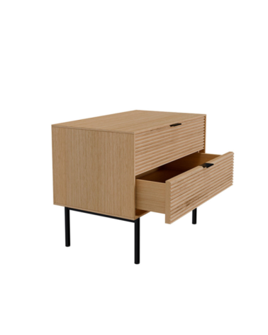 Mesita de dos cajones con estructura en chapa de roble con puertas y cajones en madera maciza de doble rayado (en frontal) y con chapa de roble natural (en resto). Guías metálicas ocultas. Apertura puertas/cajones sistema SOFT CLOSING. Pata metálica color negro. Tirador metálico.